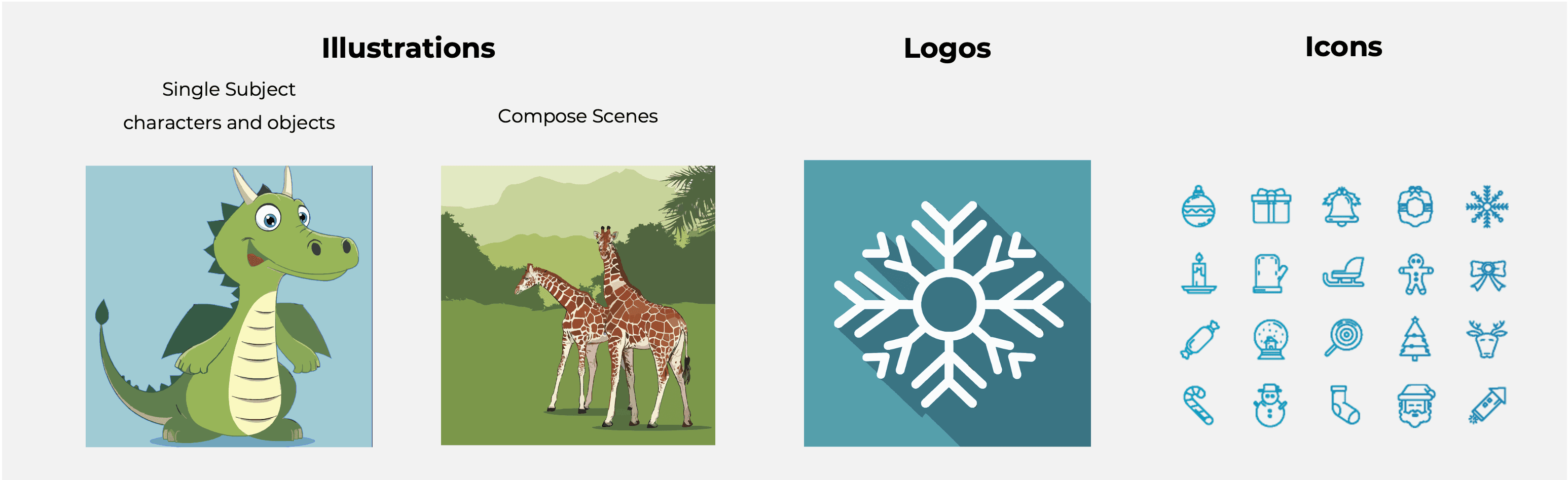 Versatile styles generated by Bria 2.3 Text-to-Vector, including logos, icons and scenes guided by text prompts